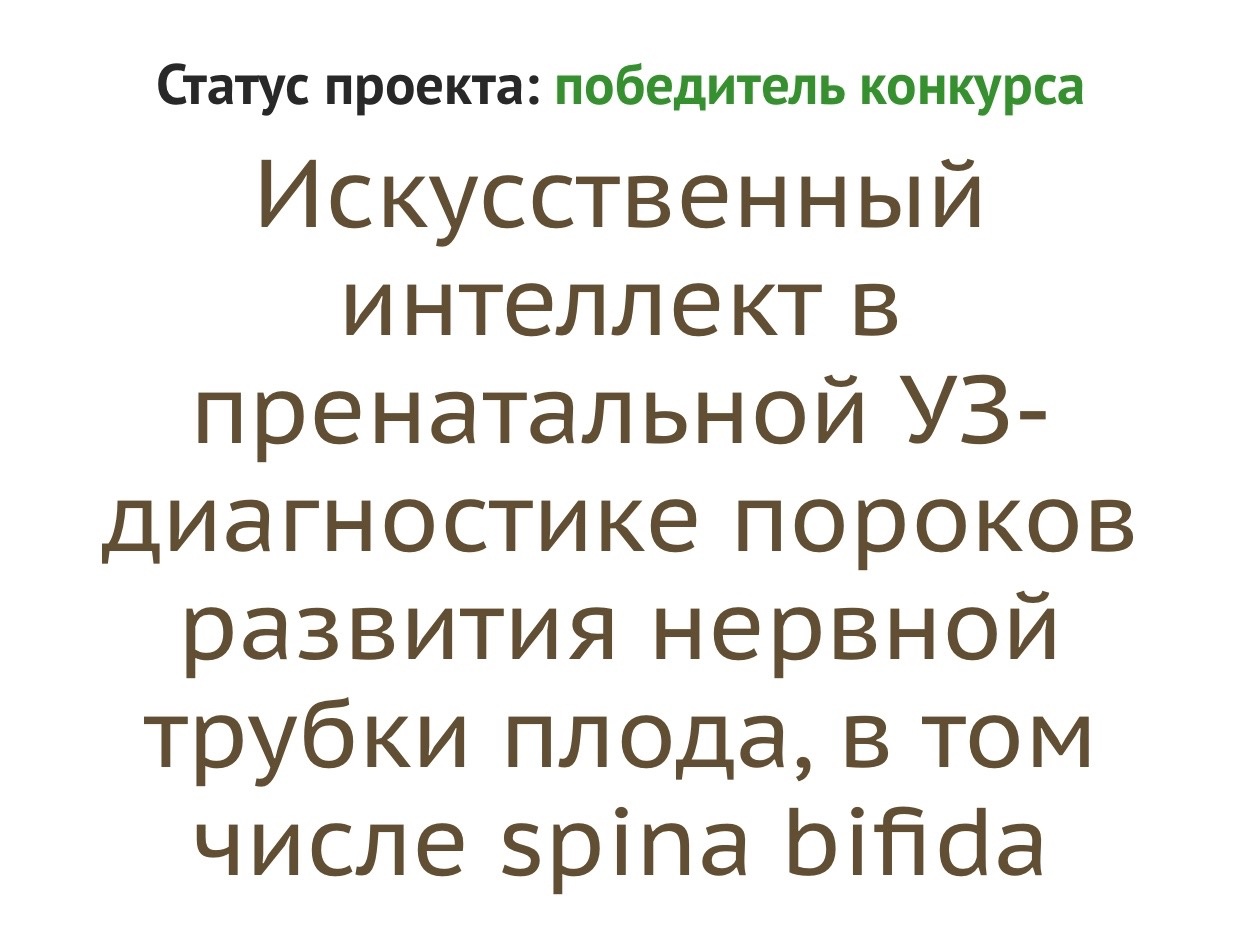Наш фонд выиграл президентский грант на создание, развитие и реализацию проекта «Искусственный интеллект в пренатальной УЗ-диагностике пороков развития нервной трубки плода, в том числе spina bifida»!